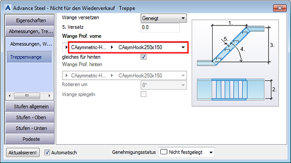 Anwenderprofile können Strukturelementen von Treppen zugewiesen werden, z. B. der Wange. Auf diese Weise können Sie für das Element jede Profilform verwenden und die aktuelle Profilbibliothek ausfüllen.