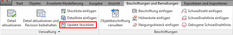 Damit die Datei mit Informationen über die Stücklisten aus Details vervollständigt wird, muss der Benutzer die Details öffnen und den Befehl Update Stückliste verwenden.