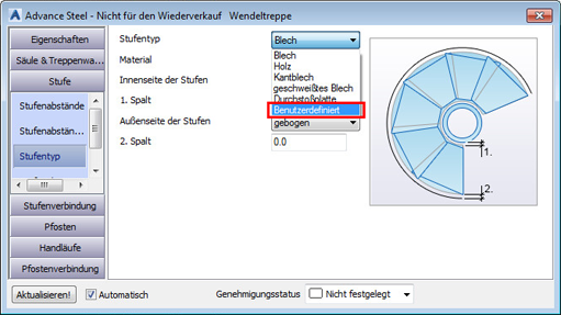 Advance Steel ermöglicht das Hinzufügen von benutzerdefinierten Stufen zum Wendeltreppen-Makro.