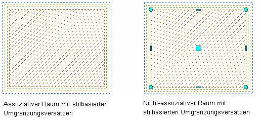 Sie können die Versätze zwischen Umgrenzungen im Raumstil festlegen. In einem nicht-assoziativen Raum mit stilbasierten Umgrenzungsversätzen können Sie nur die Basisumgrenzung mit Griffen bearbeiten. Die Netto-, nutzbare und Bruttoumgrenzung werden durch den Stil gesteuert. In einem assoziativen Raum mit stilbasierten Versätzen können Sie keine Umgrenzungen mit Griffen bearbeiten. Die Basisumgrenzung wird durch die Umgrenzungsobjekte des Raums gesteuert und die Netto-, nutzbaren und Bruttoumgrenzungen durch den Stil.