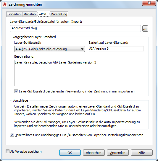 Die Layer-Einstellungen im Dialogfeld Zeichnung einrichten. Beachten Sie, dass der automatische Import eines Layer-Schlüsselstils festgelegt ist, und dass Als Vorgabe speichern aktiviert ist. Dadurch wird sichergestellt, dass der korrekte Layer-Schlüsselstil auch dann geladen wird, wenn Sie eine Zeichnung ohne Vorlage beginnen. Beachten Sie ebenfalls, dass die Option Layer-Schlüsselstil bei der ersten Verwendung in der Zeichnung immer importieren ebenfalls aktiviert ist. Dies ist eine Zeichnungseinstellung und sollte in der Vorlage festgelegt sein. Dadurch wird sichergestellt, dass der aktuelle Layer-Schlüsselstil auch in Zeichnungen verwendet wird, die bereits bearbeitet werden.