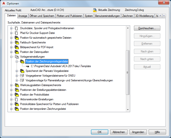 - Layer-Schlüsselstile und Layer-Standards: Diese Inhalte können zwar in einer Vorlage gespeichert werden, es ist jedoch empfehlenswert, sie stattdessen in einer Bibliothekszeichnung aufzubewahren. Im Dialogfeld Zeichnung einrichten können Sie sicherstellen, dass in neue Zeichnungen und Zeichnungen, die sich bereits in Bearbeitung befinden, beim Öffnen stets automatisch der aktuelle Layer-Schlüsselstil importiert wird. Sie arbeiten dann immer mit der aktuellen Version.