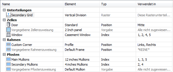 Nachdem Sie Elementdefinitionen für Fassadenstile erstellt haben, können Sie diese jedem Fassadenelementtyp zuweisen: Unterteilungen, Zellenfüllungen, Rahmen und Pfosten.