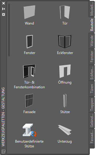 Benutzerspezifische Paletten, die von Ihrem CAD-Manager oder anderen Anwendern erstellt wurden, enthalten möglicherweise Öffnungswerkzeuge mit projekt- oder bürospezifischen Eigenschaften.