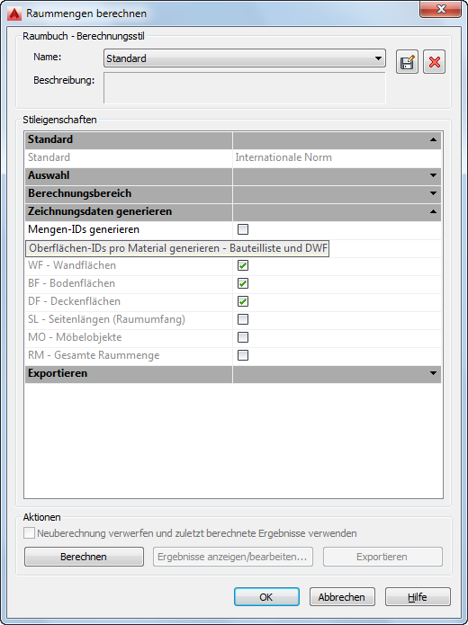 - Wählen Sie im Dialogfeld Raummengen berechnen unter Stileigenschaften in der Liste Zeichnungsdaten generieren die Option Oberflächen-IDs pro Material generieren aus.