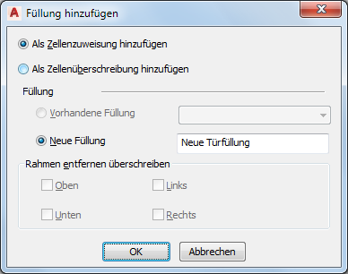 | Sie haben Als Zellenüberschreibung hinzufügen ausgewählt und möchten eine Tür, ein Fenster oder eine Tür-Fenster-Kombination mit einem anderen als dem in der Zeichnung vorhandenen Stil ohne Entfernung der Rahmenkante des Objekts einfügen. | Wählen Sie Neue Füllung, geben Sie einen Objektnamen ein, und klicken Sie auf OK. |