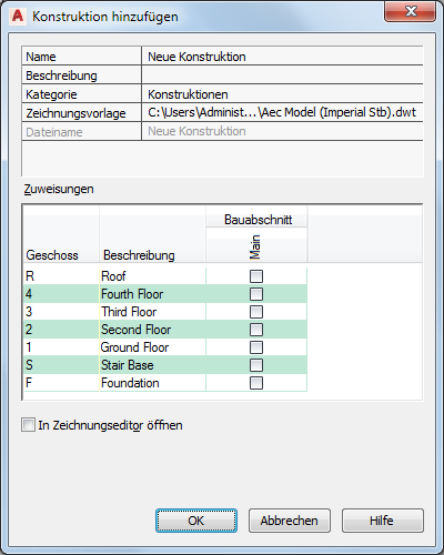 | Benennen der neuen Konstruktion | Geben Sie einen Namen ein. Bei Verwendung der Projektnummer als Präfix für Projektdateinamen ist es nicht nötig, hier ein Präfix einzugeben. Der vollständige Name mit Präfix wird unter Dateiname angezeigt. |