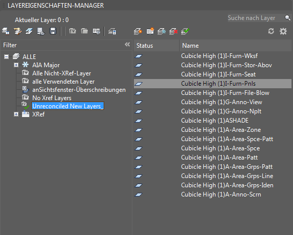 Wenn Sie auf den Link klicken, wird der Layereigenschaften-Manager geöffnet, und der Filter für nicht abgestimmte neue Layer ist automatisch ausgewählt. Alle neuen Layer, die der Zeichnung oder den angehängten externen Referenzen hinzugefügt wurden, werden in der Listenansicht angezeigt.