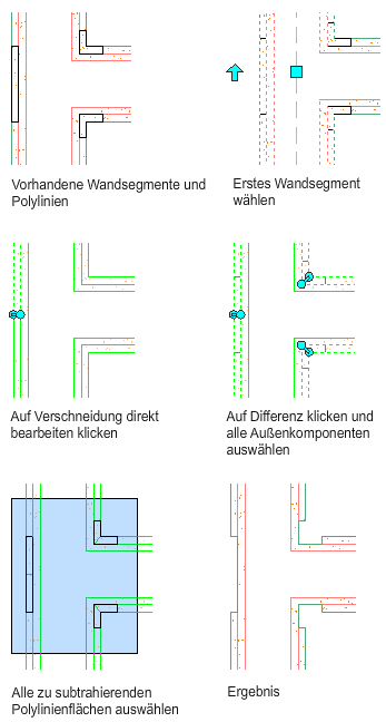 In dem folgenden Beispiel werden Profile von Außenkomponenten subtrahiert, um den Blick auf innere Wandkomponenten freizugeben.