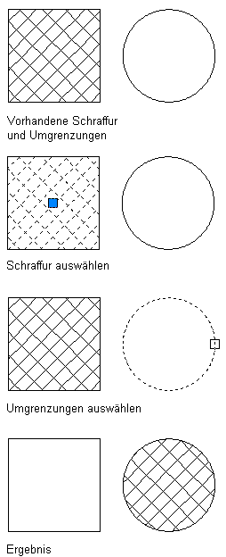 Verwenden Sie diese Vorgehensweise, um die Umgrenzungen von assoziativen oder nicht-assoziativen Schraffuren basierend auf einer beliebig gewählten geschlossenen Liniengrafik neu zu definieren. In Fällen, in denen eine nicht-assoziative Schraffur ursprünglich eine geschlossene Liniengrafik ausfüllte, aber diese Liniengrafik im Nachhinein gestreckt oder verschoben wurde, können Sie mit dieser Vorgehensweise die Schraffur erweitern oder neu positionieren, um die neue Umgrenzung auszufüllen.