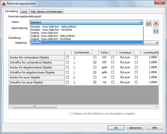 Die Objekte werden ihrer Darstellung gemäß in der Darstellungskonfiguration für Renovierungen angezeigt. Die Objektkategorien Vorhanden, Abgebrochen und Neu werden in dieser Darstellungskonfiguration angegeben und können in Draufsichten, Schnitt- und Ansichtsdarstellungen angezeigt werden.