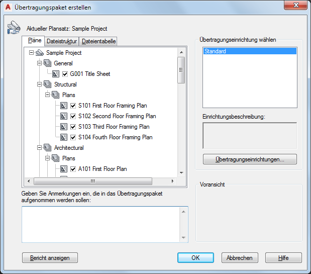 | Einbeziehen von Plansatzdaten und -dateien (DST) in das Übertragungspaket | Wählen Sie Plansatzdaten und -dateien einfügen. |