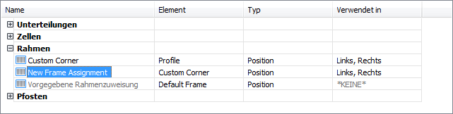 Gehen Sie wie folgt vor, um einem Fassadenelement eine Rahmenzuweisung hinzuzufügen. Um verschiedenen Rahmenkanten verschiedene Definitionen zuzuweisen, benötigen Sie mehrere Rahmenzuweisungen.