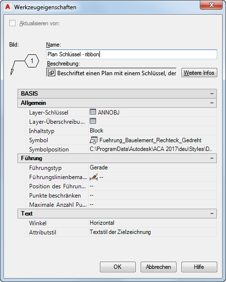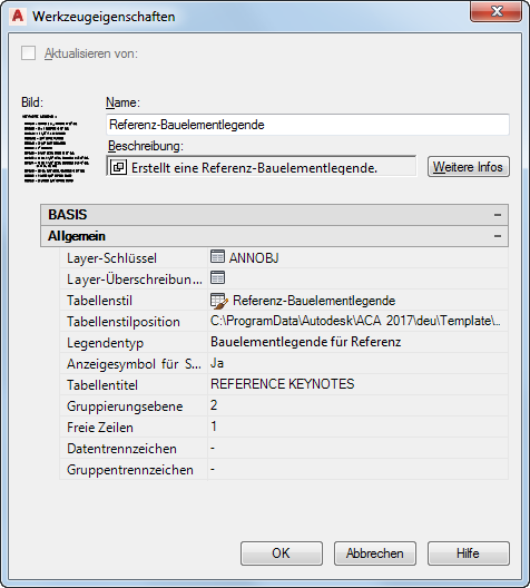 -Funktion in eine beliebige Werkzeugpalette kopieren. Die Werkzeuge zum Einfügen von Bauelementschlüsseln basieren auf dem grundlegenden Beschriftungswerkzeug und können auf dem durch das Kontextmenü aufrufbaren Arbeitsblatt Werkzeugeigenschaften weiter angepasst werden.