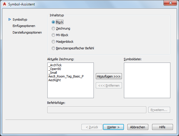 Der Symbol-Assistent hilft Ihnen bei der Erstellung eigener Symbole. Sie können Blöcke, Zeichnungen und Befehle aus Daten erstellen, die in der aktuellen Zeichnung existieren.