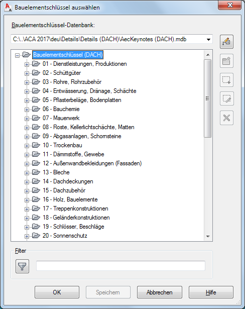 Das Dialogfeld Bauelementschlüssel wählen enthält eine hierarchische Baumstruktur der ausgewählten Bauelementschlüssel-Datenbank. Sie können in diesem Dialogfeld einen Bauelementschlüssel auswählen, der in eine Zeichnung eingefügt oder einem Objektstil, einer Materialdefinition oder einer Detailkomponente zugewiesen wird. Dieses Dialogfeld wird angezeigt, wenn Sie einem Objekt einen Bauelementschlüssel zuweisen möchten, für den noch kein Bauelementschlüssel definiert wurde. Außerdem können Sie es im Dialogfeld Schriftfeld und in den Dialogfeldern auswählen, in denen Sie Bauelementschlüssel für Architekturobjekte bzw. deren Komponenten angeben können. Beim Erstellen einer Bauelementlegende können Sie auf das Dialogfeld Bauelementschlüssel wählen zugreifen, indem Sie während des Einfügens mit der rechten Maustaste klicken und den Eintrag Von Datenbank auswählen, oder indem Sie in der Befehlszeile d (Datenbank) eingeben.