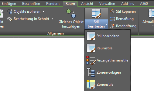 Je nach ausgewähltem Objekt haben Sie nicht nur Zugriff auf die Stile dieses Objekts, sondern auch auf Stile von unterstützenden Objekten. Haben Sie beispielsweise einen Raum ausgewählt, können Sie auf Raumstile, Zonenstile, Zonenvorlagen und Anzeigethemenstile zugreifen.