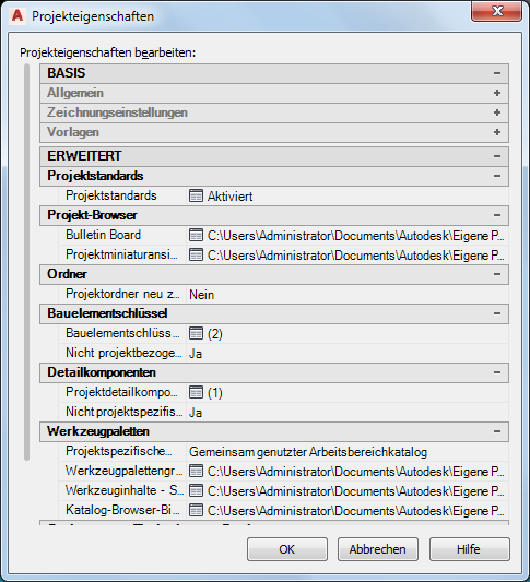 Sie können erweiterte Projekteigenschaften wie Standards, Bilder, Bauelementschlüssel, Detailkomponenten und Werkzeugpaletten definieren oder ändern.