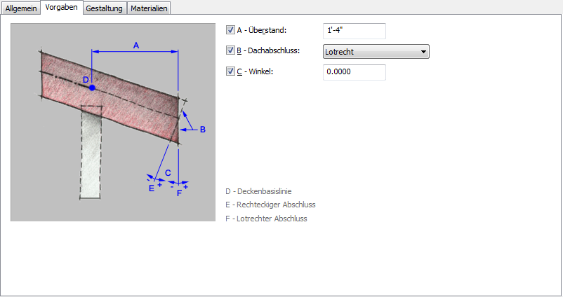 Gehen Sie wie folgt vor, um die vorgegebene Überstandstiefe, den Eckenschnitt sowie den Kantenwinkel für Decken- oder Dachelementkanten unter Verwendung eines Kantenstils festzulegen.
