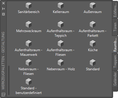 Die Werkzeugpalette Raumbuch enthält die verschiedenen Oberflächematerialstile. Die Befehle sind mit der Datei
