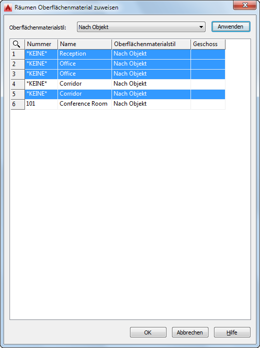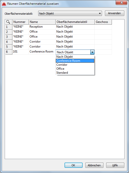 - Weisen Sie im Dialogfeld Räumen Oberflächenmaterial zuweisen den Oberflächenmaterialstil zu, und klicken Sie auf Anwenden.