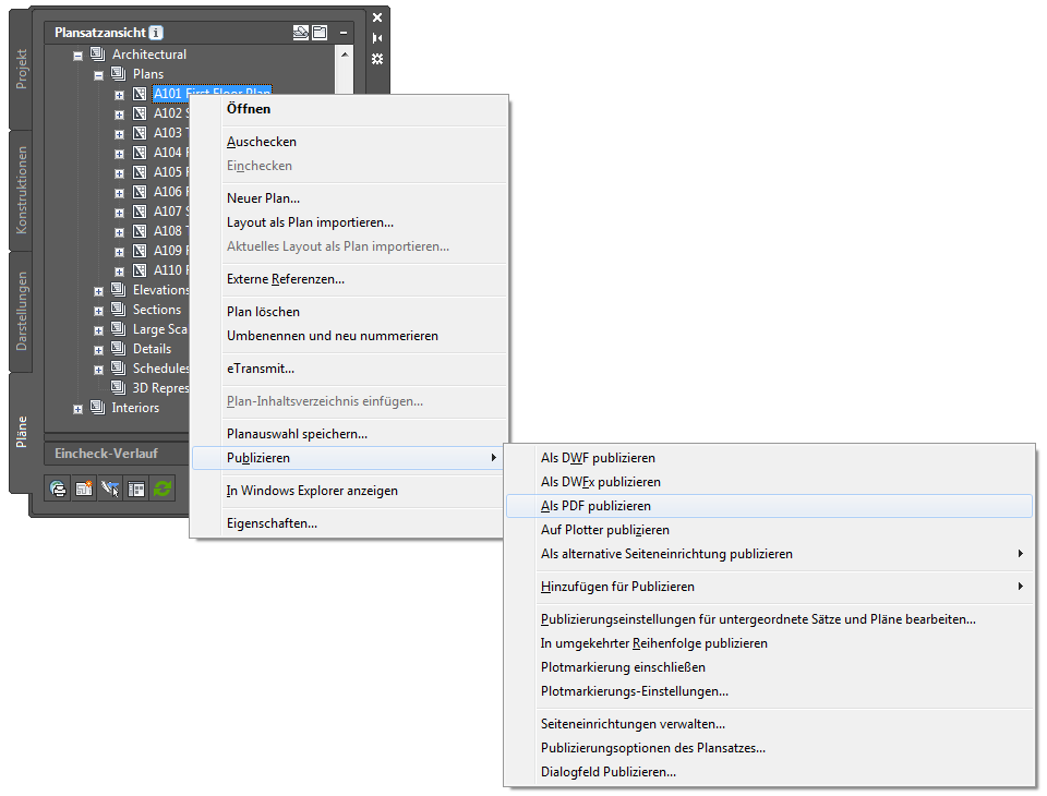 In der Plansatzansicht können Sie Pläne auf einem Plotter, in eine PDF-, eine DWF- oder DWFx-Datei ausgeben. Sie können den Plansatz mit Plotmarkierungen versehen, Pläne mit einer alternativen Seiteneinrichtung publizieren und Einstellungen zum Publizieren im PDF-, DWF- und DWFx-Format festlegen.