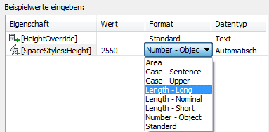 Wenn eine Eigenschaftsdefinition zum ersten Mal in eine Formel eingefügt wird, wird der zugehörige Beispielwert entweder von einem Objekt in der aktuellen Zeichnung, das die Eigenschaftssatz-Definition der Formel verwendet, oder von einem vorgabemäßigen Objekt genommen.