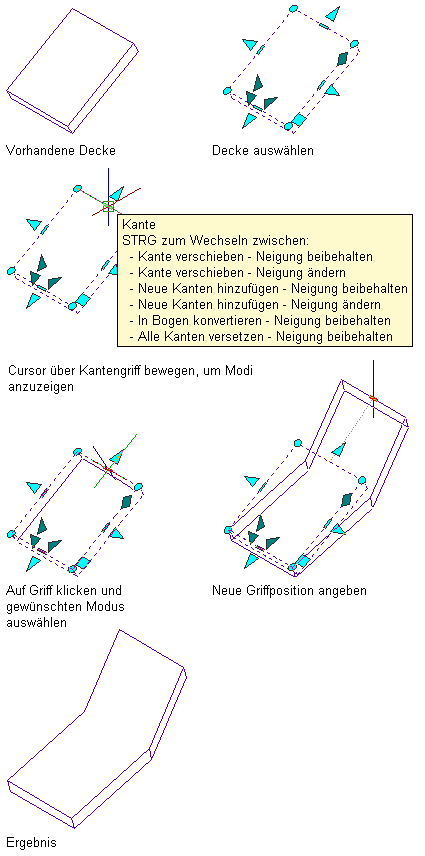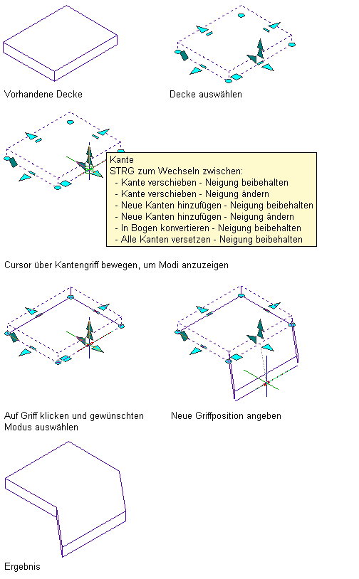 Mit den Kantengriffen können Sie die Größe, Form und Neigung einer ausgewählten Decke bzw. eines ausgewählten Dachelements ändern, indem Sie jeweils eine Kante verschieben. Wenn Sie den Cursor auf einen Kantengriff verschieben, zeigt eine QuickInfo-Nachricht die verfügbaren Bearbeitungsmodi an. Die einzelnen Modi werden im Anschluss an die folgende Vorgehensweise beschrieben. Nachdem Sie auf den Kantengriff geklickt haben, können Sie durch Drücken der Taste STRG zwischen den Modi wechseln.
