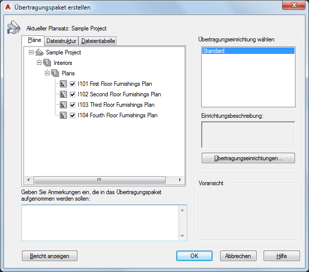Bei der elektronischen Übertragung können Sie einen Dateisatz in elektronischer Form als Paket übermitteln. Die Zeichnungsdateien im Übertragungspaket enthalten auch alle relevanten Zusatzdateien wie externe Referenzen und Schriftartendateien.