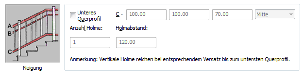 | Festlegen der Höhe des untersten Profils auf einem Treppenlauf | Geben Sie einen Wert für Neigung ein. |
