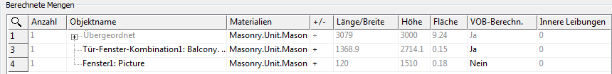 Ein Beispiel wäre, wenn angrenzende Fenster und Türen eine Einheit bilden und auch als eine Einheit berechnet werden müssen. Wenn Sie die Berechnungsregeln global ändern möchten, ändern Sie die Berechnungseinstellungen und berechnen die Raummengen erneut.
