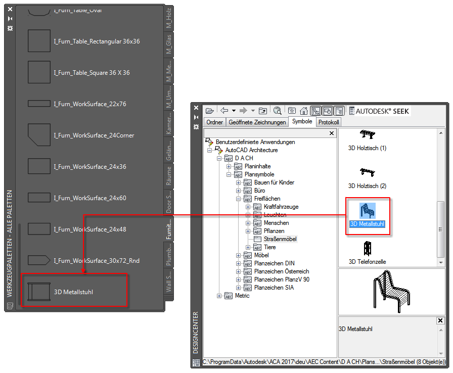 Sie können Symbole von einem DesignCenter-Ordner ziehen und auf einer Werkzeugpalette ablegen.