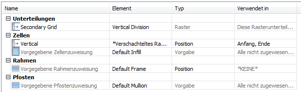 Sie können in der Registerkarte Gestaltung des Dialogfelds Eigenschaften für Fassadenstil verschachtelte Raster definieren. Die Raster werden im linken Fensterausschnitt in einer Baumstruktur aufgeführt. Es gibt immer ein Primärraster. Das Primärraster kann ein oder mehrere Sekundärraster haben. Jedes sekundäre Raster kann ein oder mehrere Tertiärraster haben, usw.