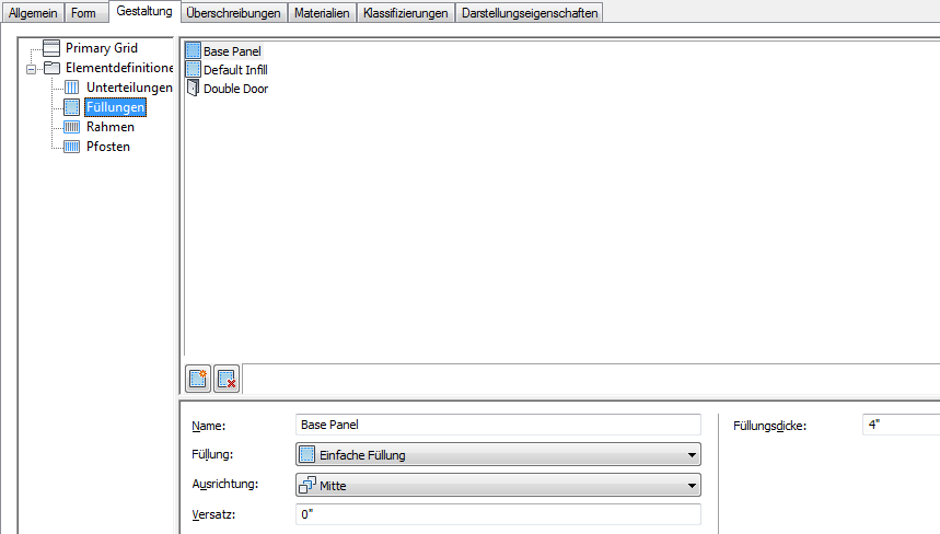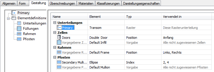 Sie können Elementdefinitionen mithilfe der Registerkarte Gestaltung des Dialogfelds Stileigenschaften für Tür-Fenster-Kombination ändern. Sie können von der Zuweisungsliste und von der Definitionsliste aus auf diese Definitionen zuzugreifen.