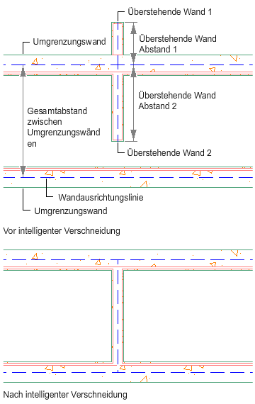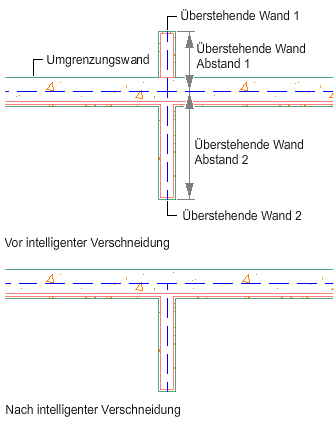 Beim Verschneiden von mehreren Wandverschneidungen werden überstehende Wände auf die als Umgrenzung dienenden angrenzenden Wände gestutzt oder erweitert. Nur ausgewählte Wandsegmente sind in der Verschneidung enthalten.