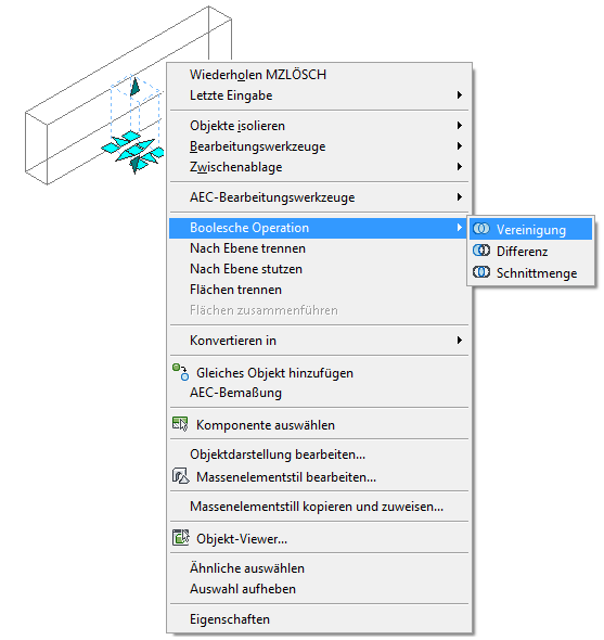 Sie können einen 3D-Modifikator einem Wandkörper hinzufügen und dann direkt bearbeiten. Körpermodifikatoren nutzen die dreidimensionale Geometrie eines Objekts (z. B. eines Massenelements oder einer Massengruppe), um eine Wandkomponente durch Addition oder Subtraktion zu verändern oder sie vollständig zu ersetzen.