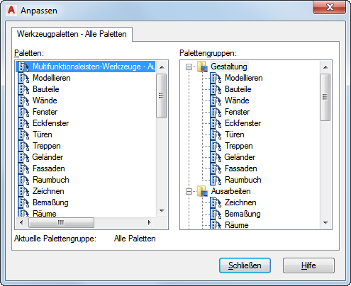 . - Enthält die projektspezifische Werkzeugpalettengruppe mindestens eine Palette, wird sie in der Liste der verfügbaren Werkzeugpalettengruppen angezeigt und kann ausgewählt werden.