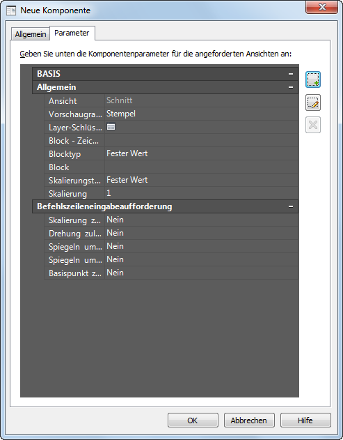 Gehen Sie wie folgt vor, um einer Detailkomponenten-Datenbank eine Komponente und eine leere Größentabelle mit verschiedenen Zeilen für die Größen hinzuzufügen, in denen die Komponente verfügbar ist. Die beim Hinzufügen einer Komponente im Dialogfeld Neue Komponente auf den Registerkarten Allgemein und Parameter festgelegten Werte werden zur Erstellung von einer oder mehreren Bauanleitungen zum Zeichnen der Komponente in verschiedenen Ansichten verwendet. Jede Bauanleitung gibt den Typ der Vorschaugrafik oder Zeichnungsroutine an, der zum Platzieren der Komponente in eine bestimmte Ansicht verwendet wird. Die Bauanleitung kann außerdem Informationen zu Layer und Schraffurmuster enthalten.