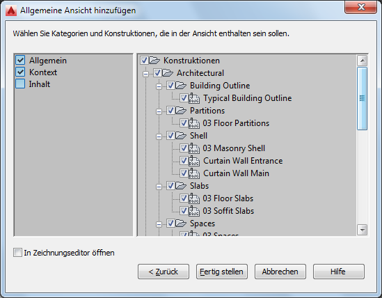 Gehen Sie wie folgt vor, um den Inhalt, das heißt die in die Ansicht zu referenzierenden Konstruktionen, auszuwählen. Per Vorgabe wird jede Konstruktion als externe Referenz als Anhang hinzugefügt.