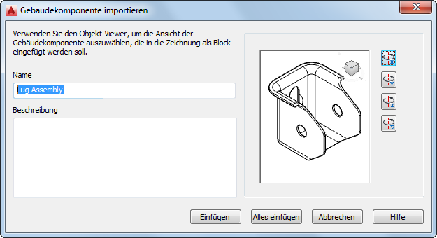 - Beim Einfügen eines einzelnen Blocks ist das Bild im Viewer der einzufügende Block, z. B. Vorderansicht, Draufsicht usw. Bei axonometrischen Ansichten wird der 3D-Block eingefügt.