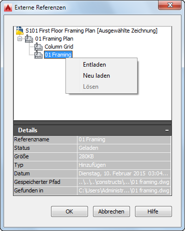 Die angehängte XRef kann über das Kontextmenü entladen, neu geladen oder gelöst werden.