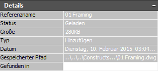 - Gefunden in zeigt den Pfad an, in dem die XRef gefunden wurde. Wenn kein Pfad für die XRef gespeichert wurde oder die XRef nicht mehr im angegebenen Pfad enthalten ist, sucht das Programm nach der XRef und zeigt den Speicherort hier an.