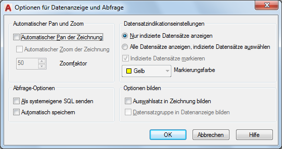 Eine Beschreibung aller verfügbaren Optionen finden Sie in der Befehlsreferenz unter DBVERBINDUNG im Dialogfeld Optionen für Datenanzeige und Abfrage.