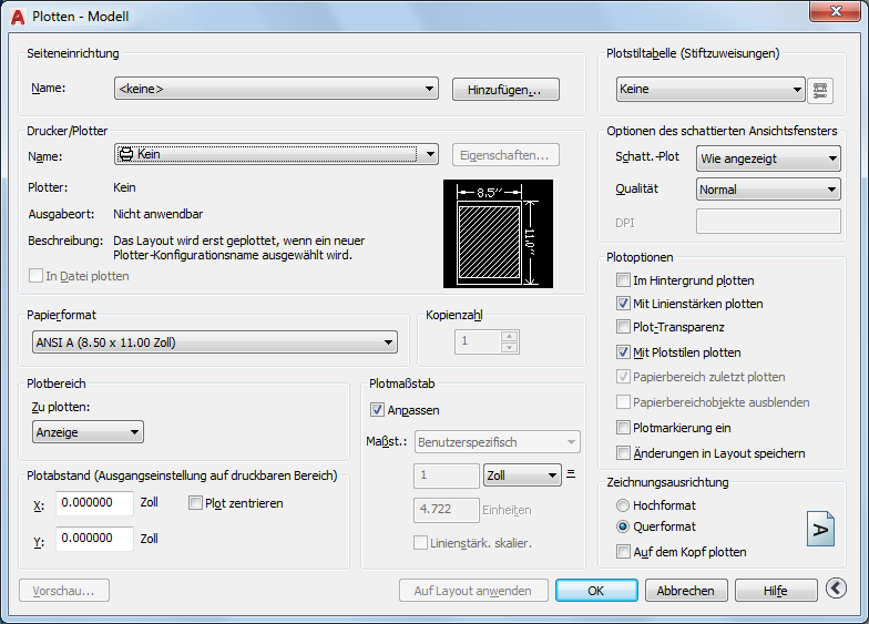 Wählen Sie das Papierformat, den Plotbereich, den Plotmaßstab, die Ausrichtung und weitere Optionen.