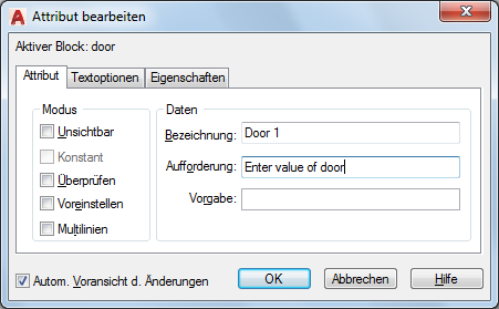 Definiert, wie einem Attribut ein Wert zugewiesen wird und ob der zugewiesene Wert im Zeichnungsbereich sichtbar ist. Außerdem wird hier die Zeichenfolge festgelegt, die den Benutzer zur Eingabe eines Wertes auffordert. Die Registerkarte Attribut zeigt außerdem die Bezeichnung an, die das Attribut kennzeichnet.