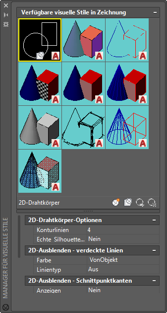 Der Manager für visuelle Stile enthält einen Bereich mit Beispielbildern der visuellen Stile, die in der Zeichnung verfügbar sind, sowie folgende Eigenschaftenfenster:
