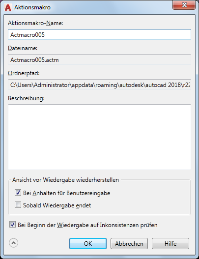 Sie können das aktuelle Aktionsmakro speichern oder umbenennen und sein Wiedergabeverhalten definieren. Die Anzeige dieses Dialogfelds kann unterdrückt werden, indem Sie die Einstellung Aufforderung für Aktionsmakro-Name im Dialogfeld Aktionsrekorder-Voreinstellungen deaktivieren.