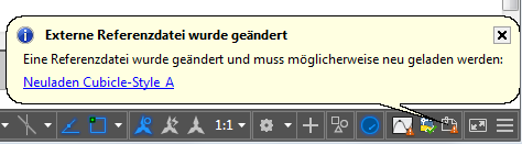 Wenn sich eine referenzierte Datei geändert hat, wird in der rechten unteren Ecke des Anwendungsfensters (im Spezialfeld der Statusleiste) neben dem XRef-Symbol standardmäßig eine Meldung eingeblendet. Klicken Sie auf die Verknüpfung in der Sprechblase, um die geänderten XRefs neu zu laden.