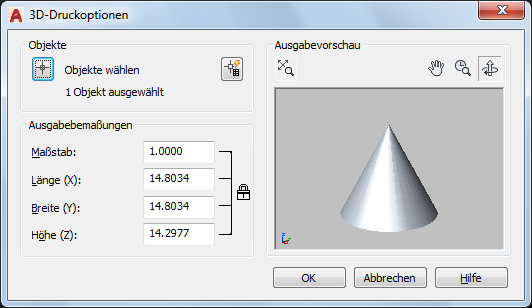 Das Dialogfeld 3D-Druckoptionen wird bei Verwendung der Befehle 3DDRUCK oder 3DDRUCKSERVICE angezeigt. Sie können die Ausgabegröße anzeigen und ändern bzw. den Ausgabemaßstab angeben, ohne dass sich dies auf die Gesamtproportionen auswirkt.