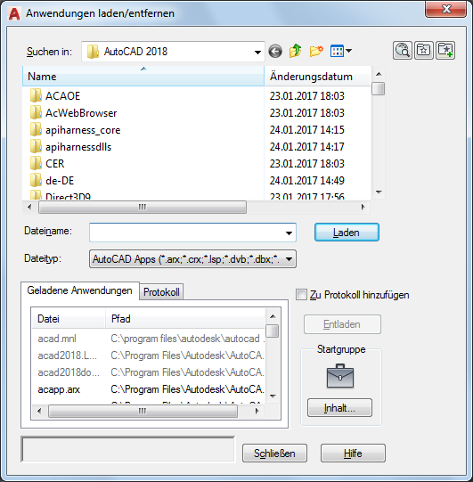 Wenn Sie eine bereits geladene Datei wählen, wird die Anwendung gegebenenfalls erneut geladen. ObjectARX-Anwendungen können nicht neu geladen werden. In diesem Fall entfernen Sie zunächst die ObjectARX-Anwendung und laden sie dann erst erneut. Die Option Laden steht auch in einem Kontextmenü zur Verfügung; klicken Sie hierzu mit der rechten Maustaste auf eine Datei auf der Registerkarte Protokoll.